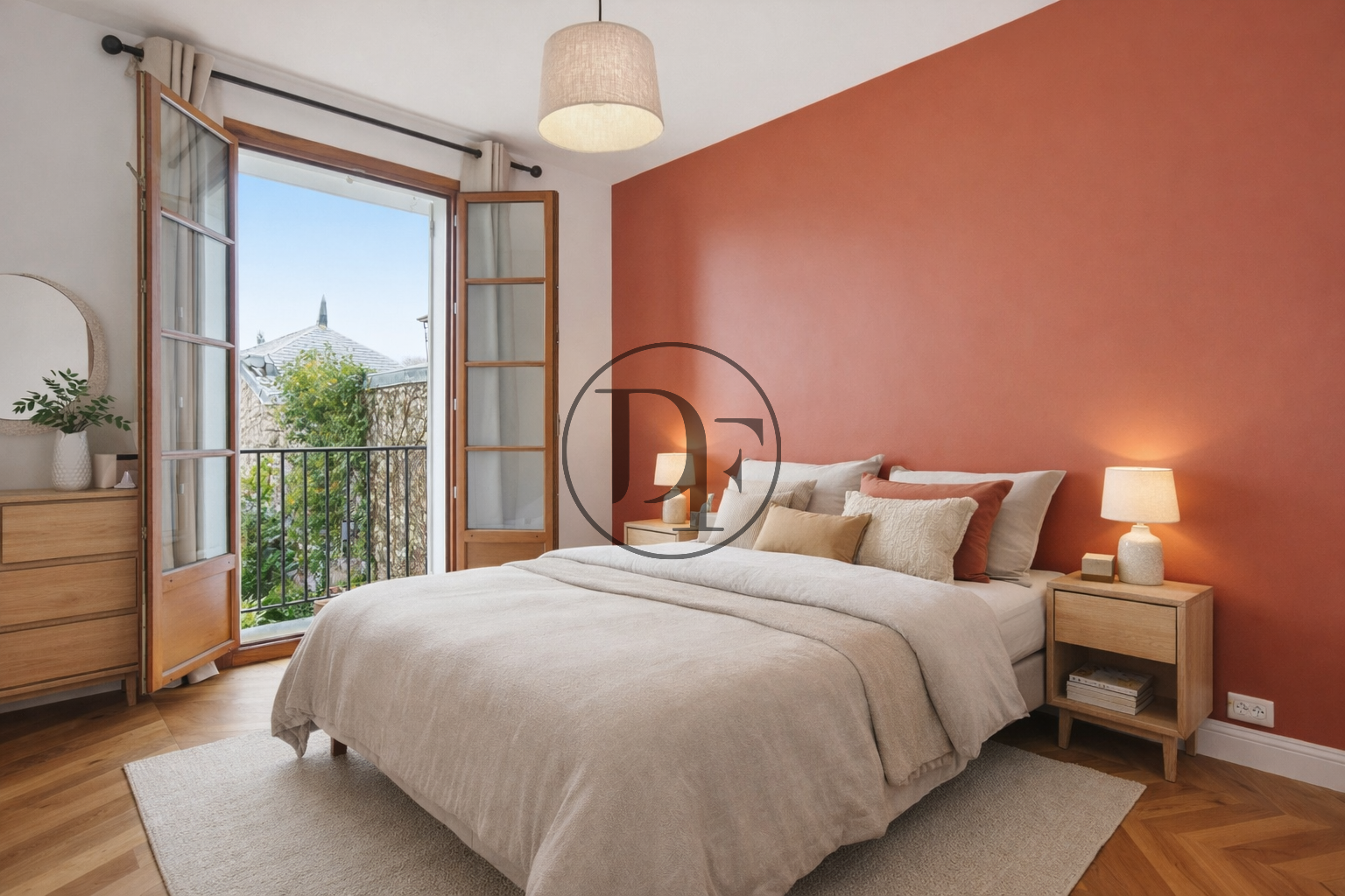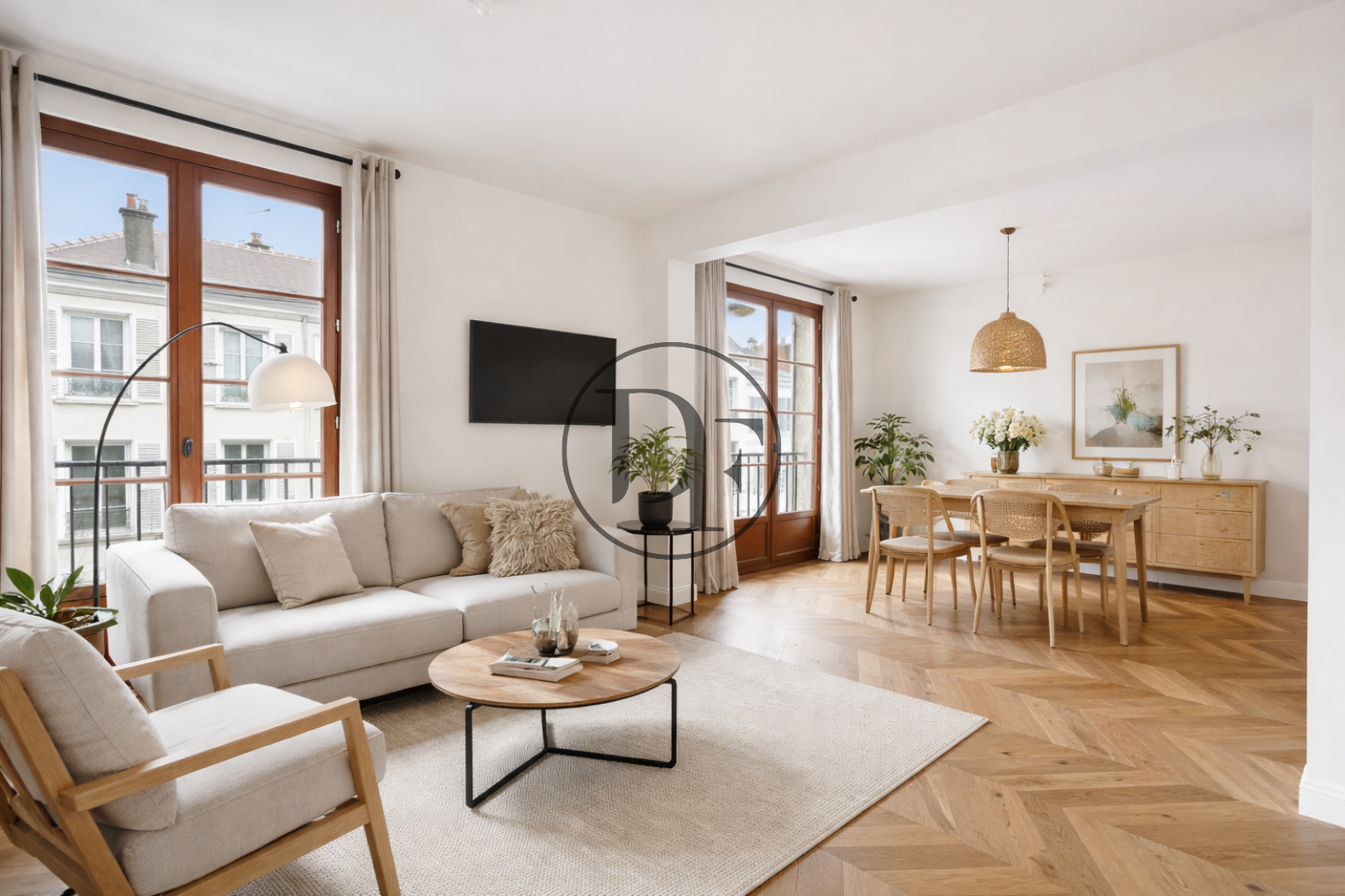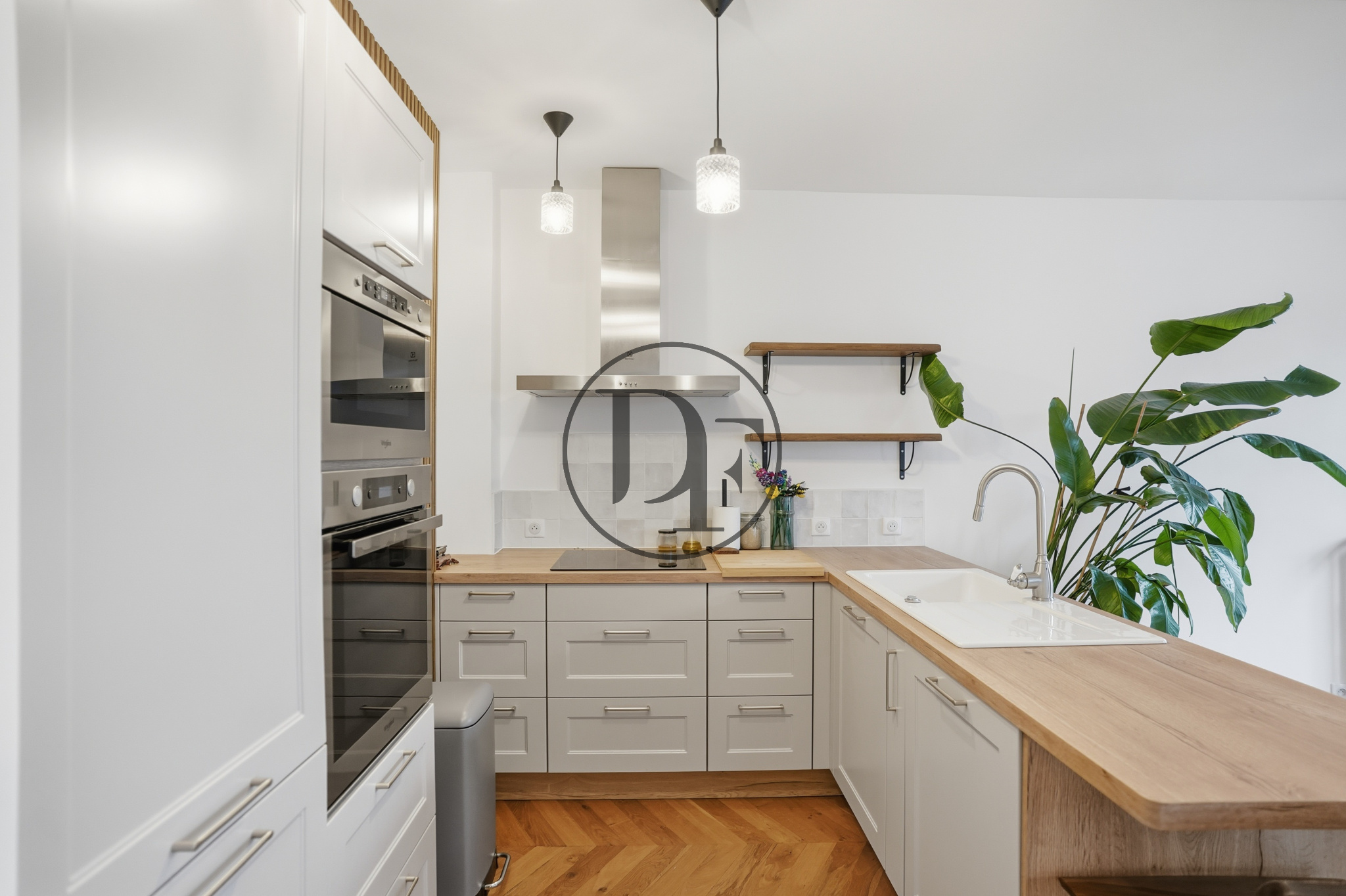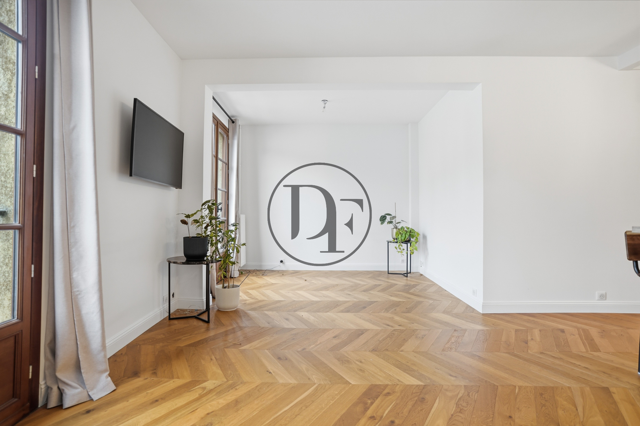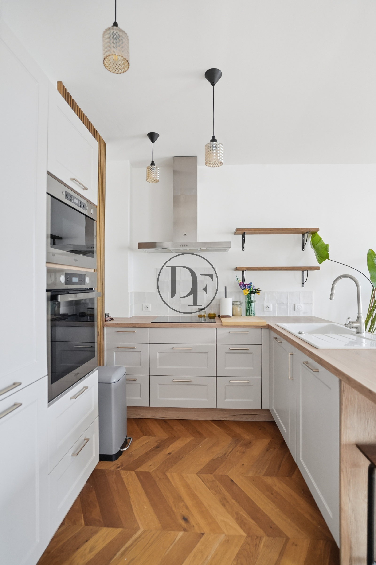 Il se compose d’une belle pièce de vie lumineuse, offrant une cuisine entièrement aménagée et équipée avec espace repas, ouverte sur un salon/séjour chaleureux sublimé par un parquet en pointe de Hongrie, présent dans l’ensemble de l’appartement.