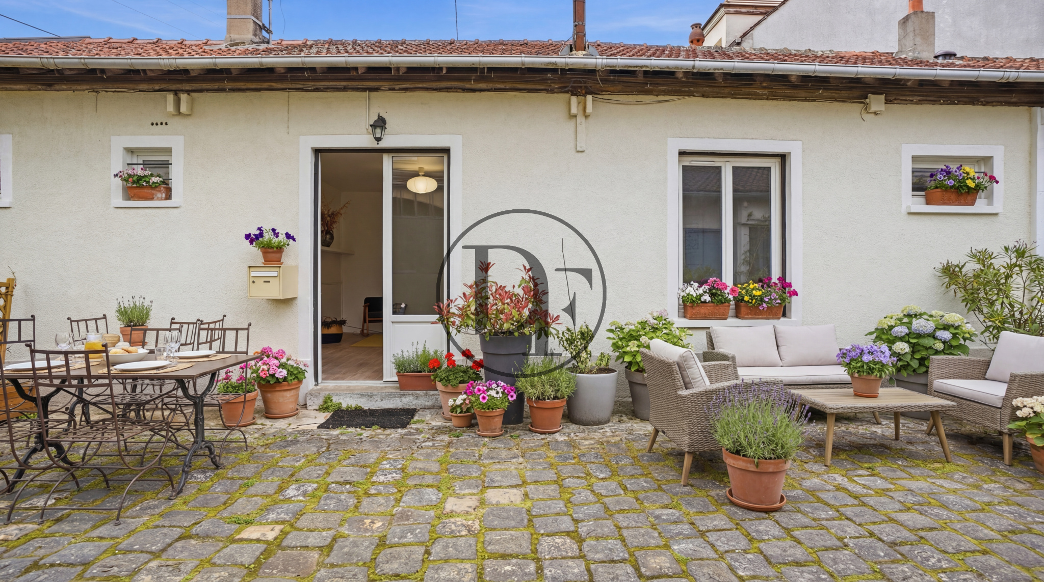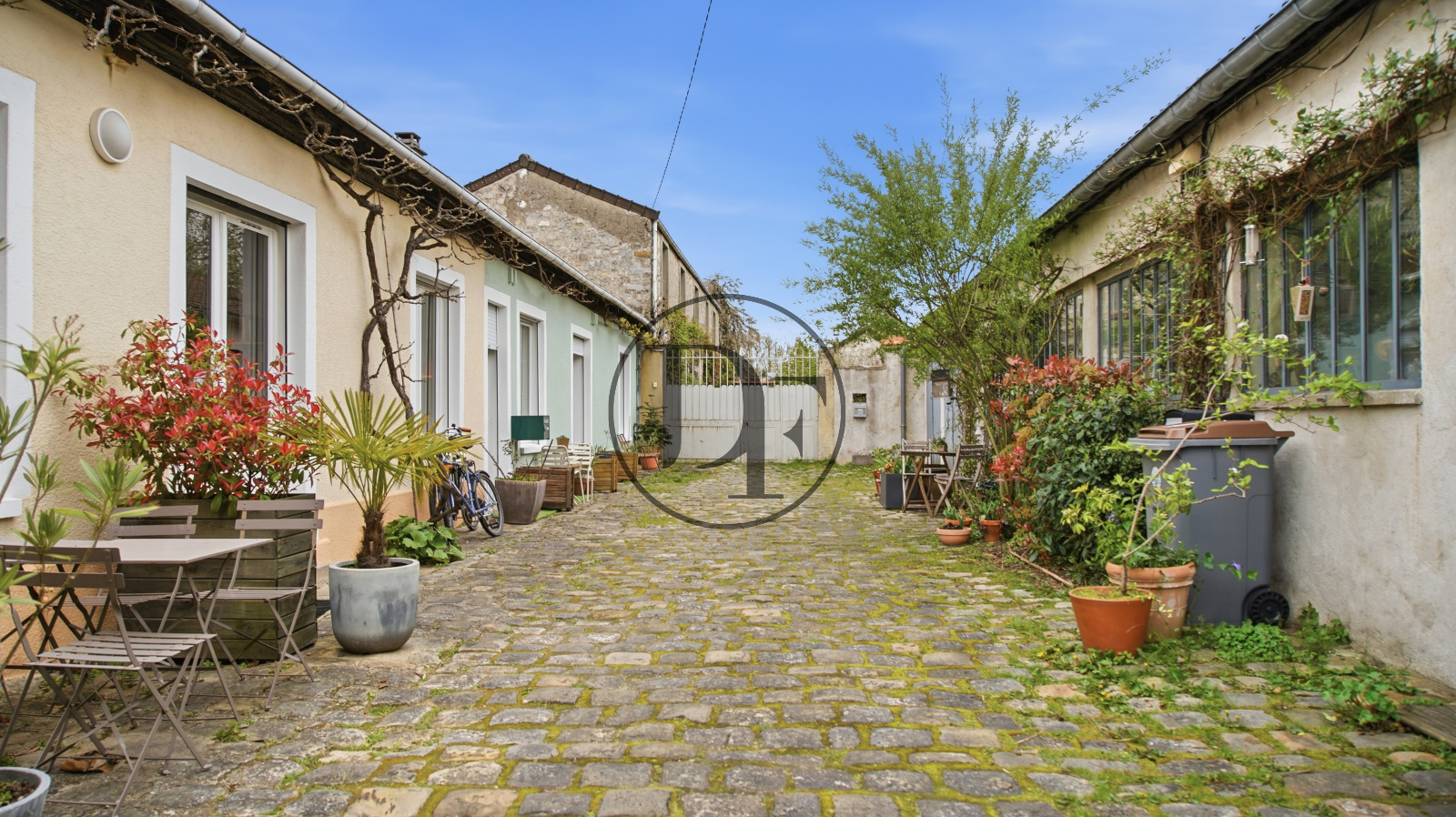 À l'extérieur, vous profiterez d'une cour commune privée et sécurisée. Chaque copropriétaire a aménagé son espace avec tables, chaises et salon de jardin, créant une atmosphère conviviale.