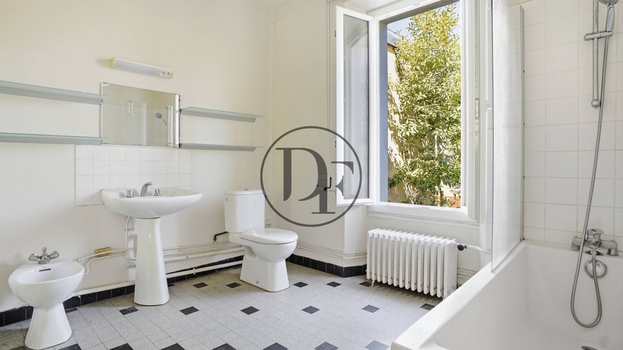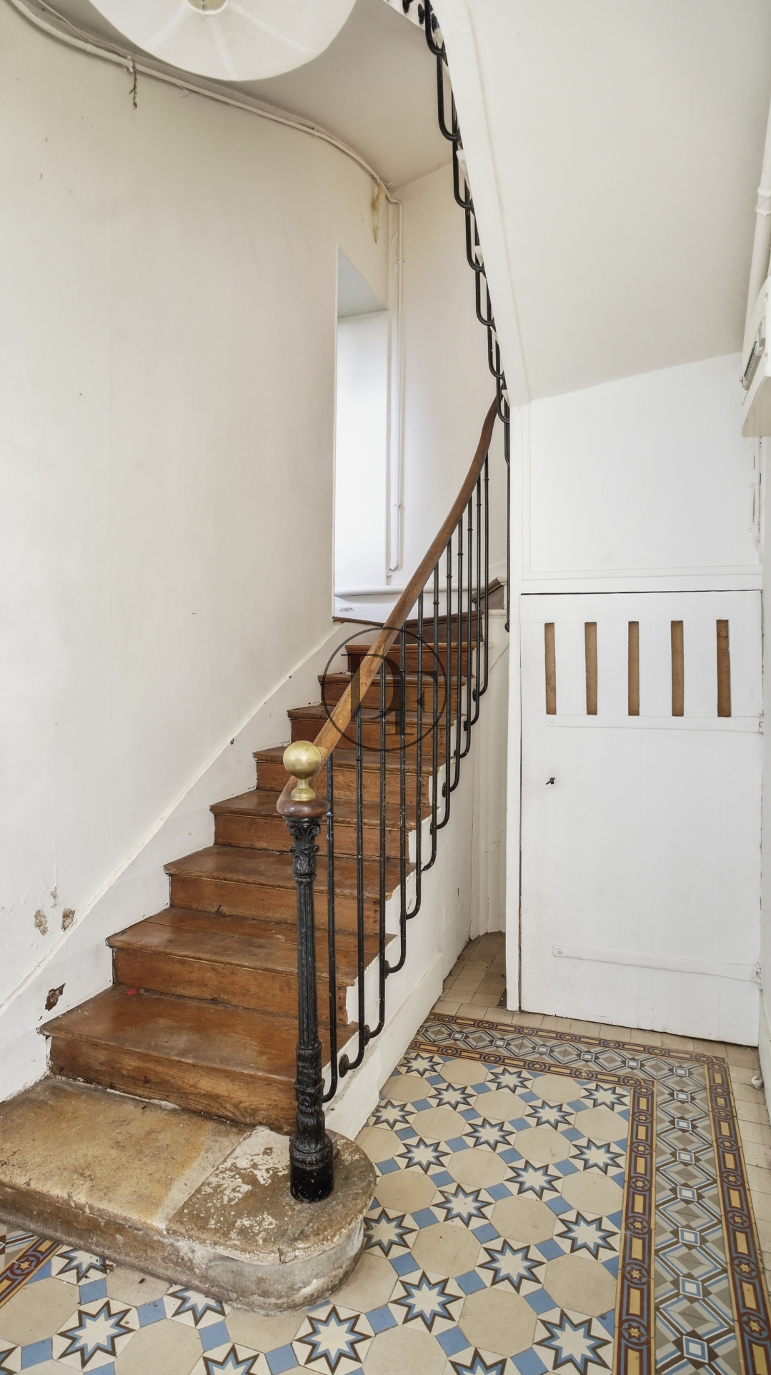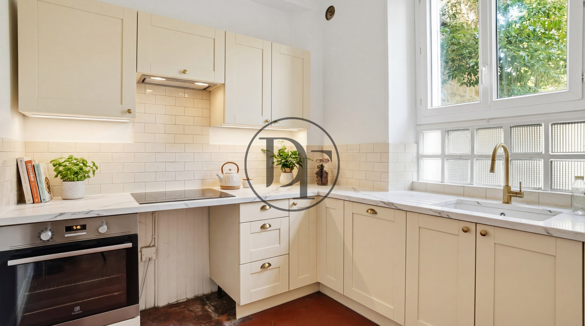 Vous serez accueilli par une entrée avec un sol en véritables carreaux ciment desservant un salon et un séjour avec cheminée d’époque. Dans le prolongement, vous trouverez une cuisine indépendante, ainsi qu’un accès à une cave voûtée de 20 m². Au fond du couloir, une porte s’ouvre sur la terrasse et le jardin arrière. Des toilettes séparées sont également situées sur le demi-palier.