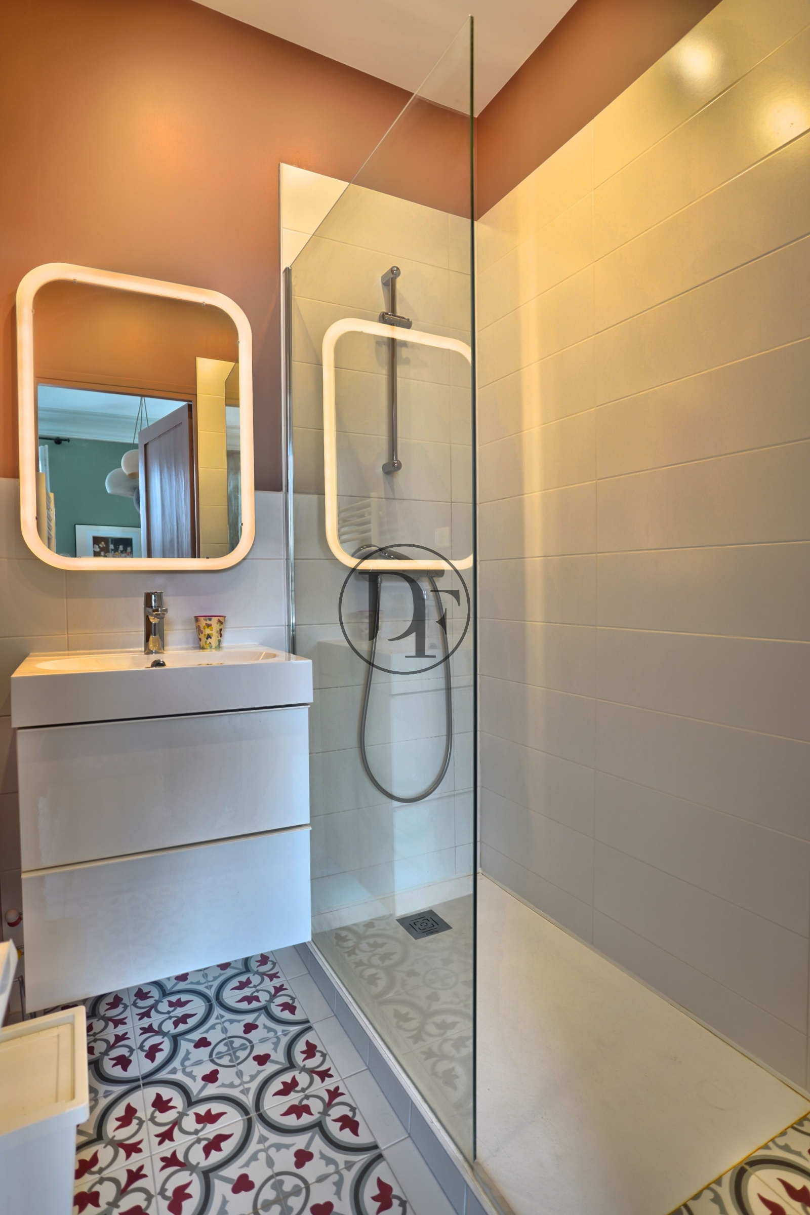 Au premier étage, un palier dessert un toilette indépendant avec lave-mains, une suite parentale avec dressing, salle de bains et toilette, ainsi qu’une chambre avec salle d’eau, toutes les deux présentant une belle hauteur sous plafond.