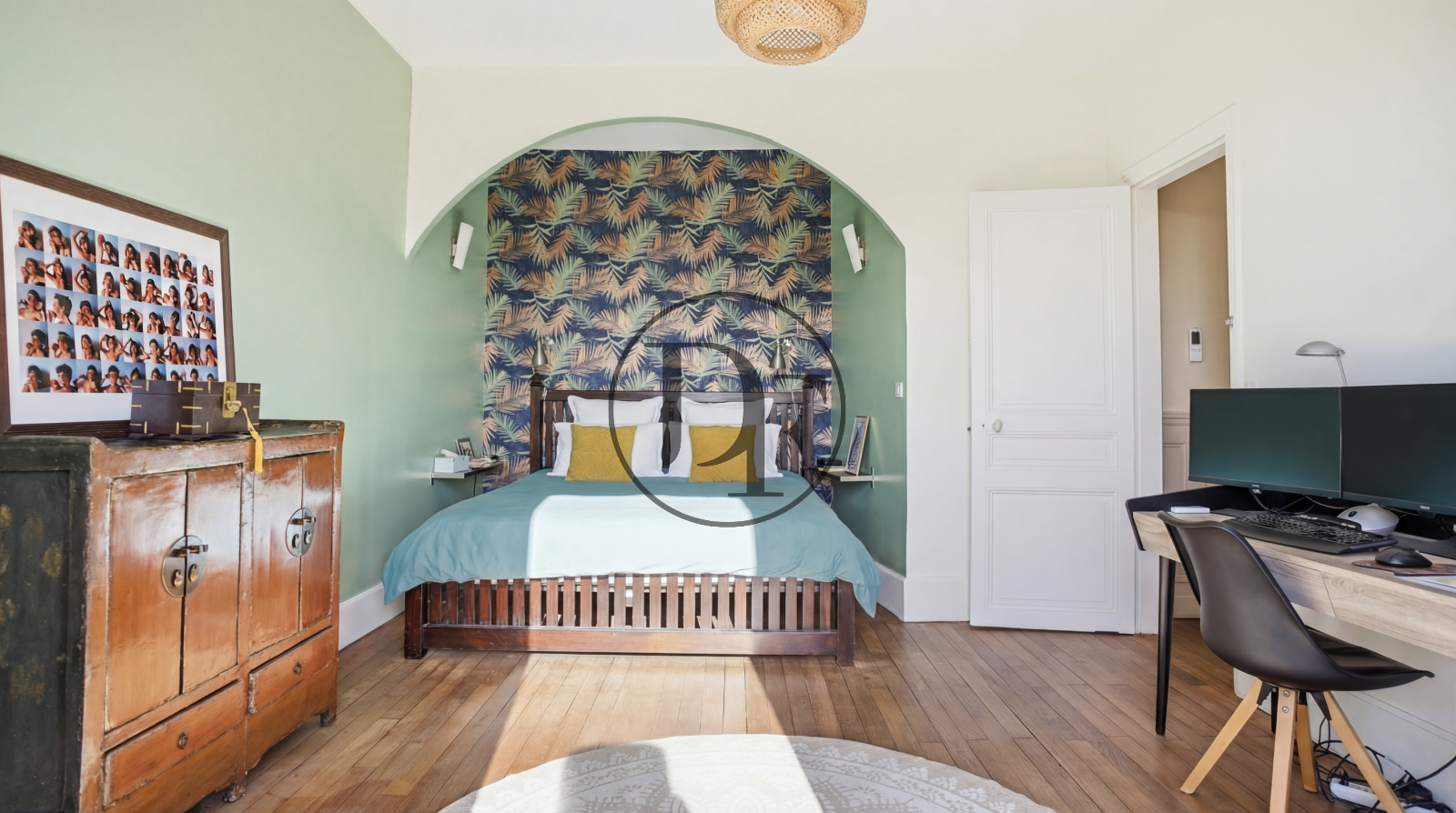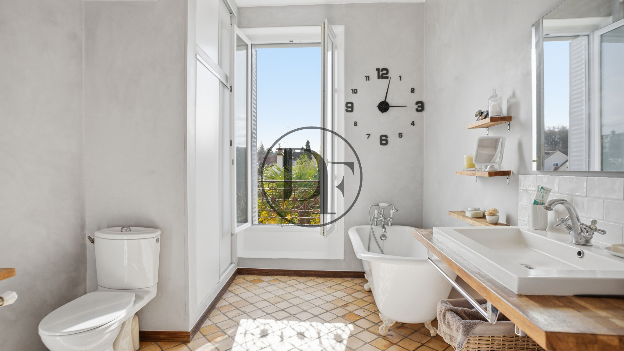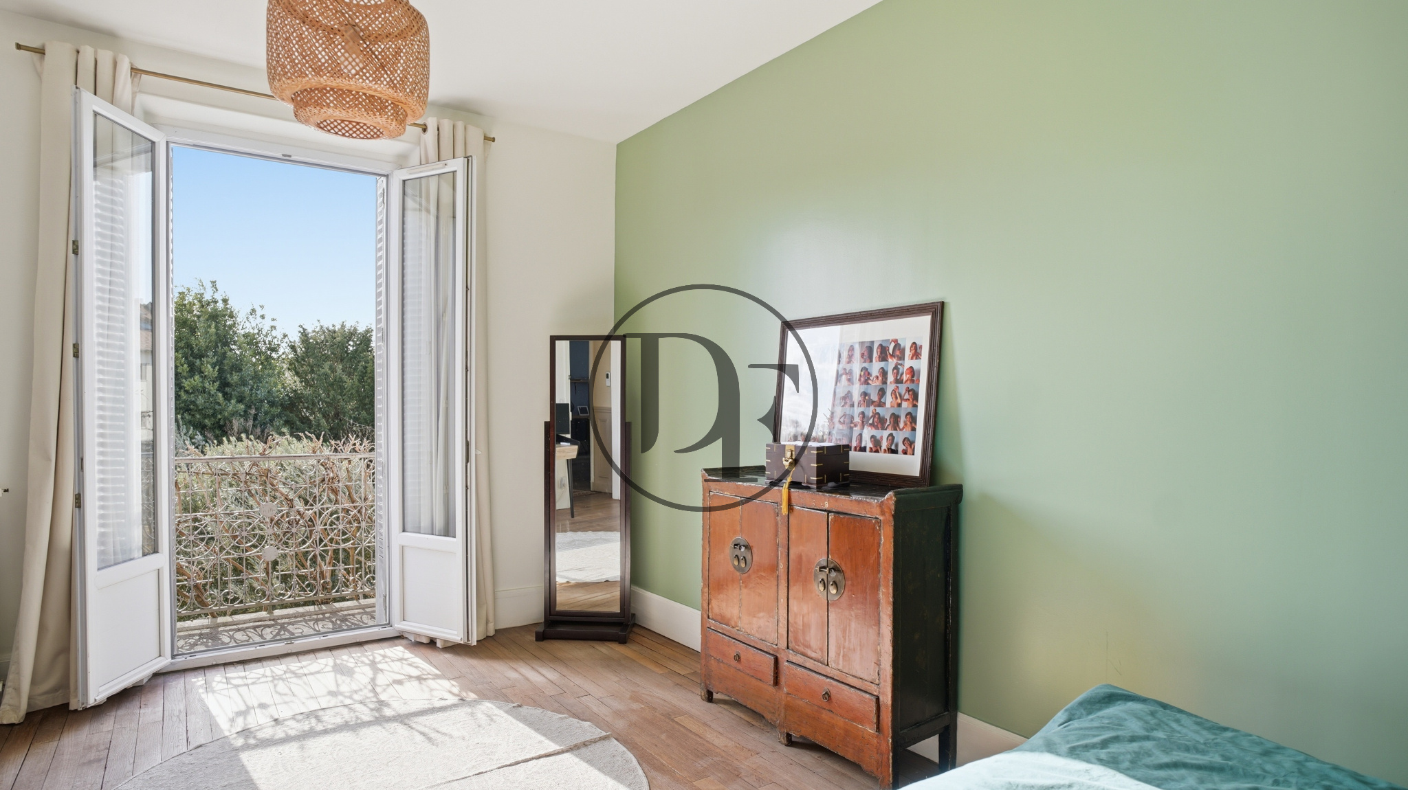 Le premier étage accueille un vaste palier desservant un dressing central, une élégante salle de bains avec baignoire à pieds de lion et douche à l’italienne, des toilettes ainsi qu’un espace dressing complémentaire. Trois belles chambres parquetées, dont une avec balcon, complètent ce niveau.