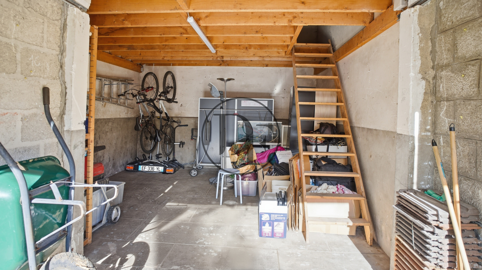 Un garage de 20 m² avec mezzanine, équipé d’une prise pour la recharge d’un véhicule électrique, complète le bien.