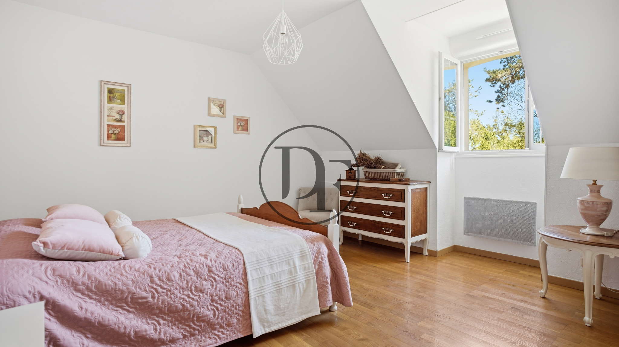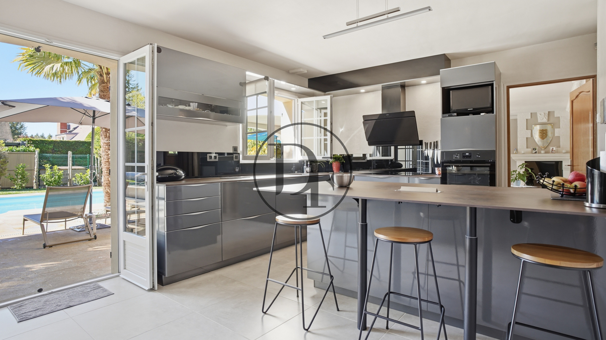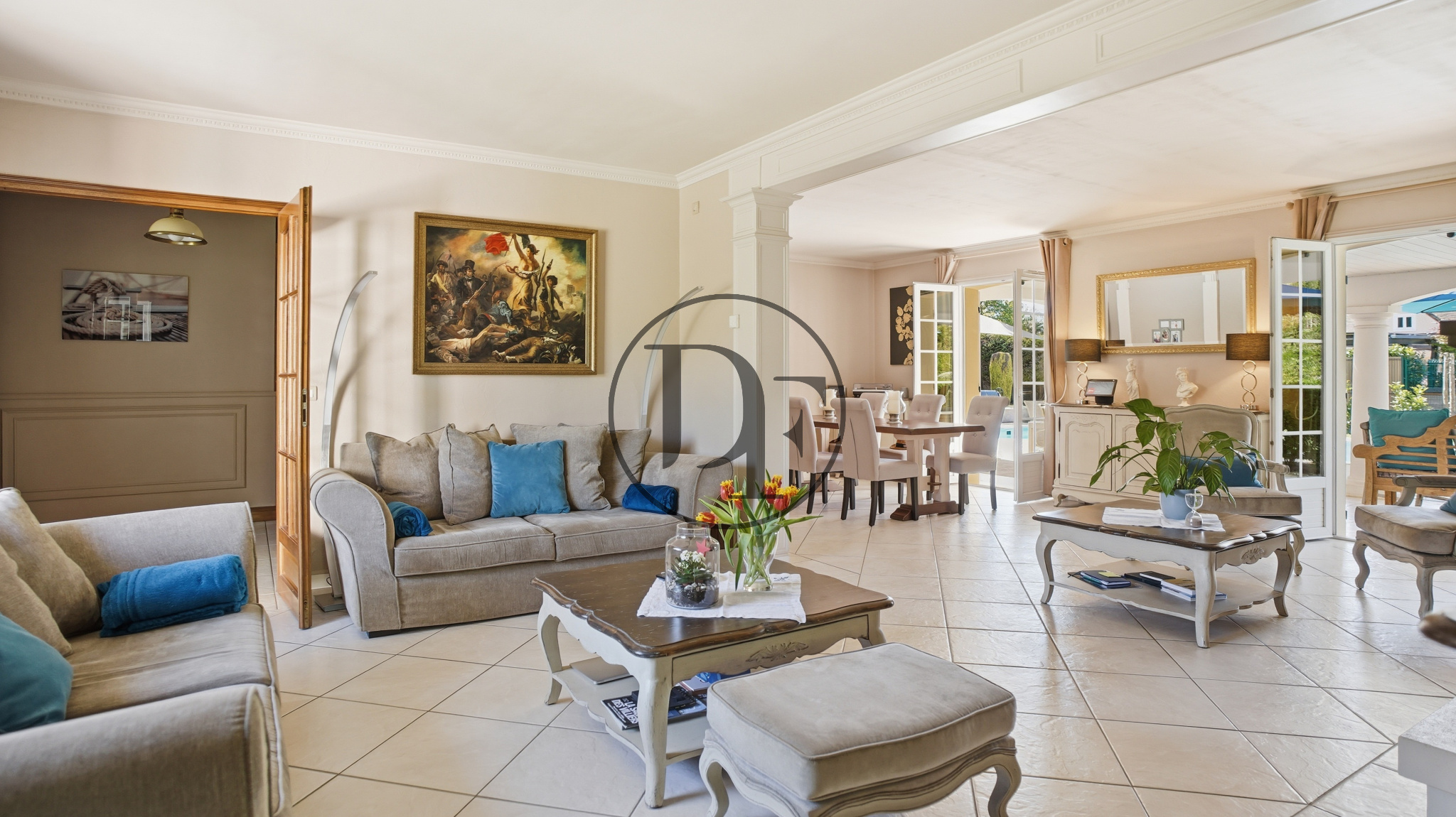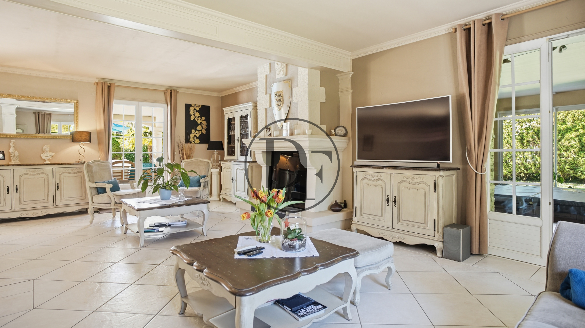 La maison se compose, au rez-de-chaussée, d’une belle entrée, d’une vaste pièce de vie lumineuse avec cheminée ouverte, le tout donnant sur une terrasse bien exposée avec vue sur le jardin et la piscine.