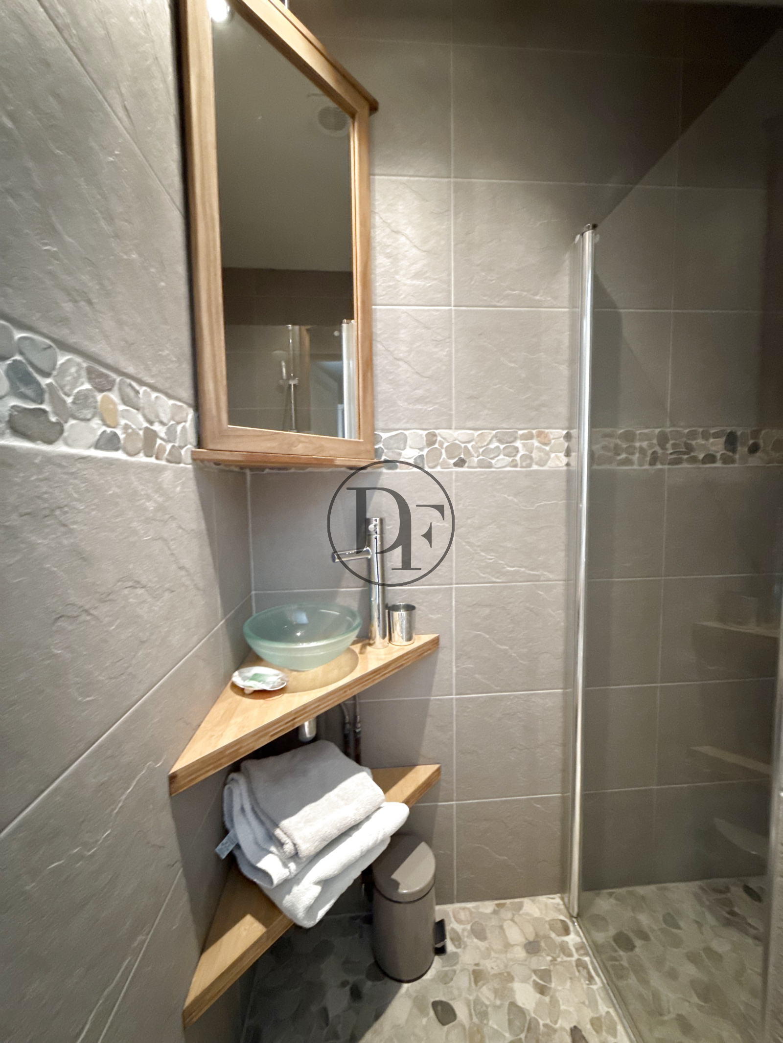 L'annexe de 55 m², totalement indépendante et accessible directement depuis la route, se compose d'un salon-séjour avec coin cuisine, d'une salle d’eau avec toilettes, et à l'étage, d'un palier menant à deux chambres.
