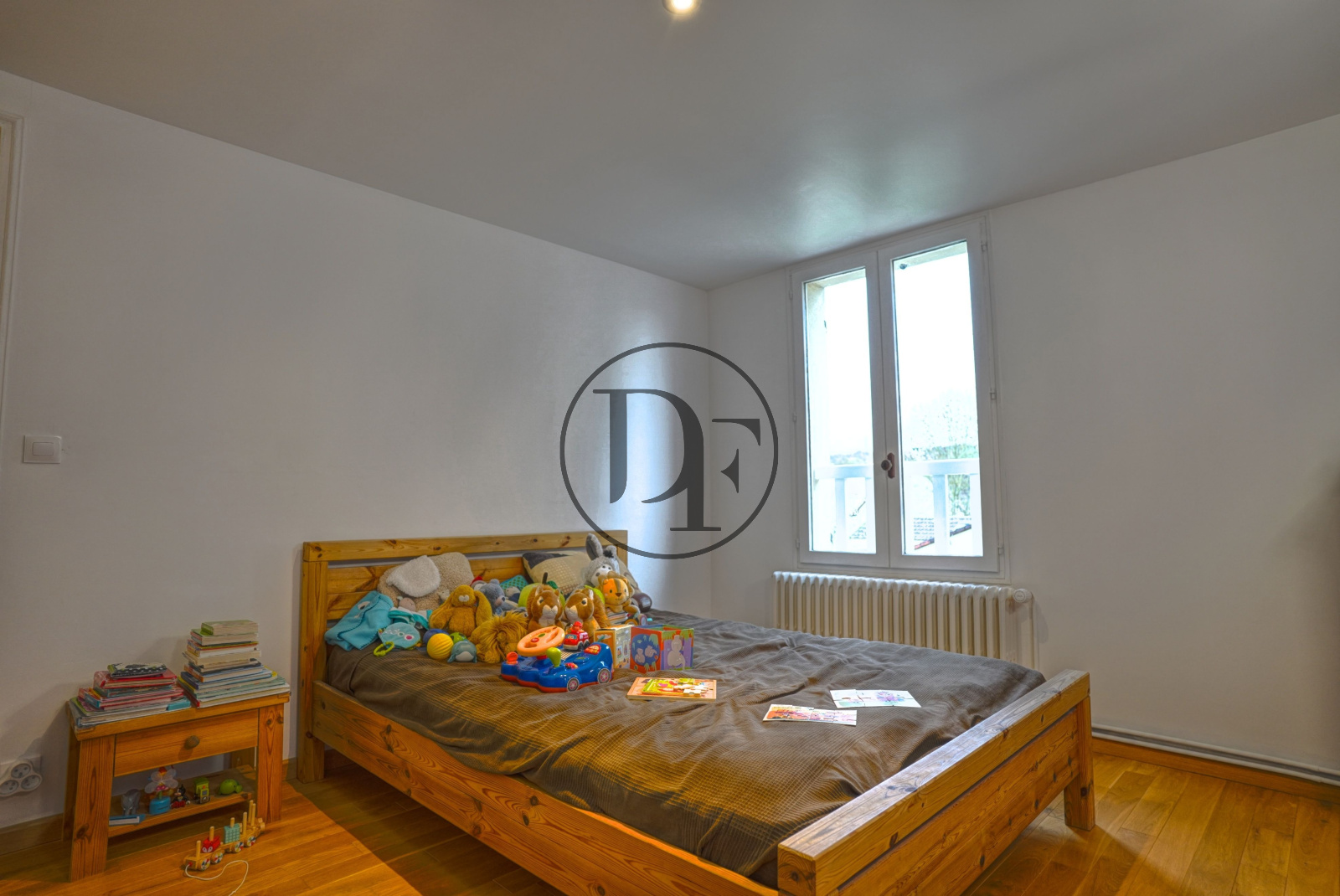 À l’étage, un palier dessert deux grandes chambres avec rangements ainsi qu’une salle de bains avec toilettes.