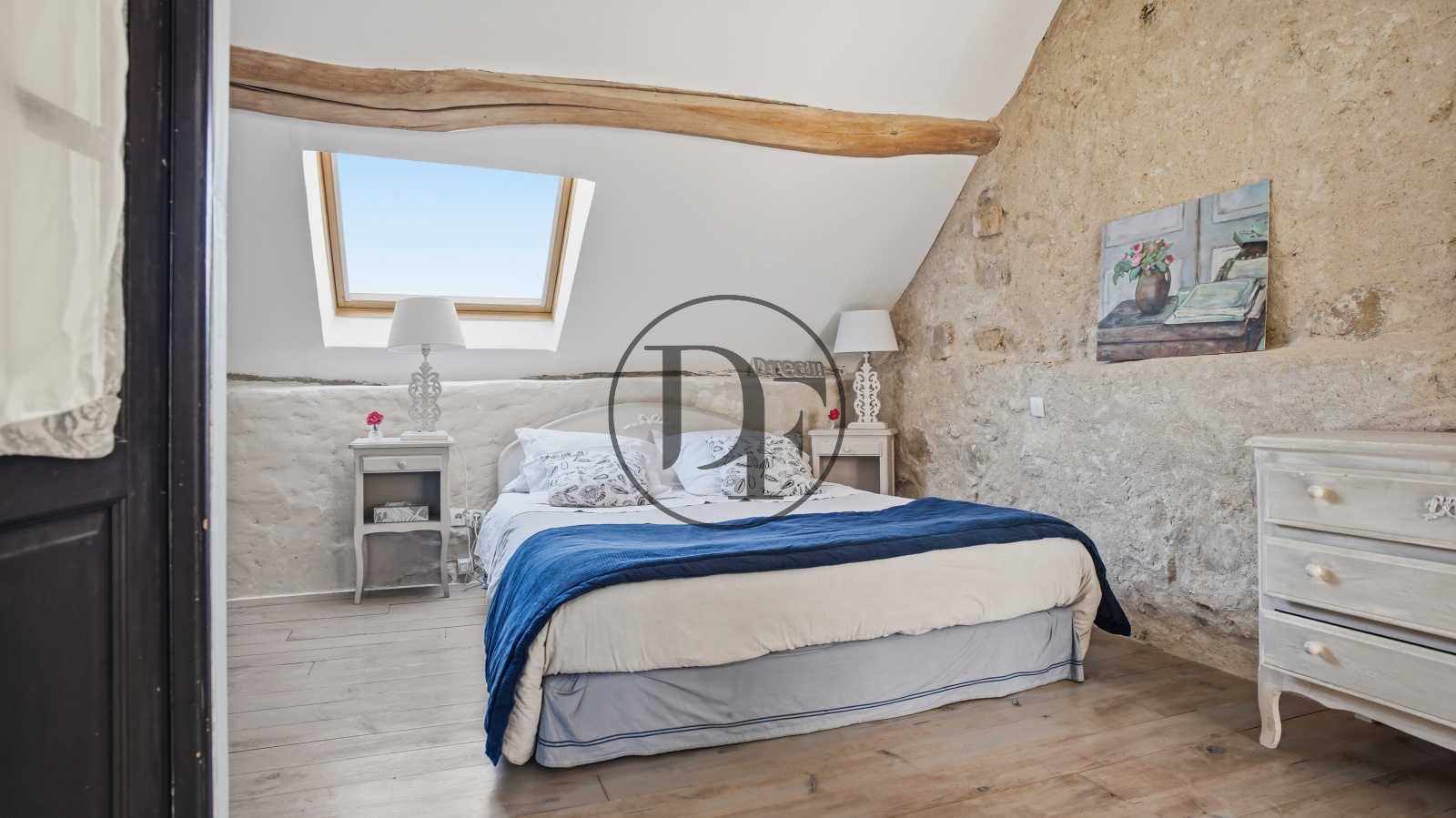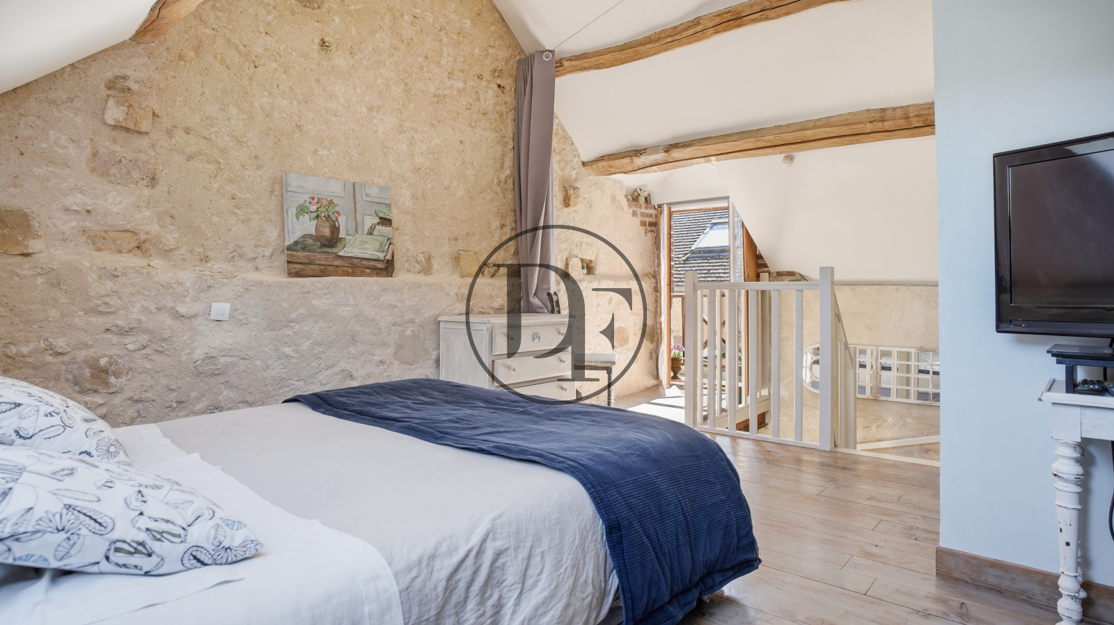 A l’étage, une chambre avec salle d’eau et toilettes. Idéal pour une activité de location saisonnière ou pour accueillir famille et amis en toute autonomie.