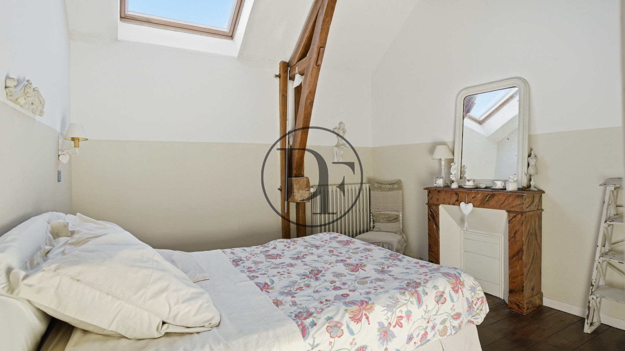 TOMETTES ANCIENNES, POUTRES APPARENTES ET PARQUET EN CHENE ET CHÂTAIGNIER.