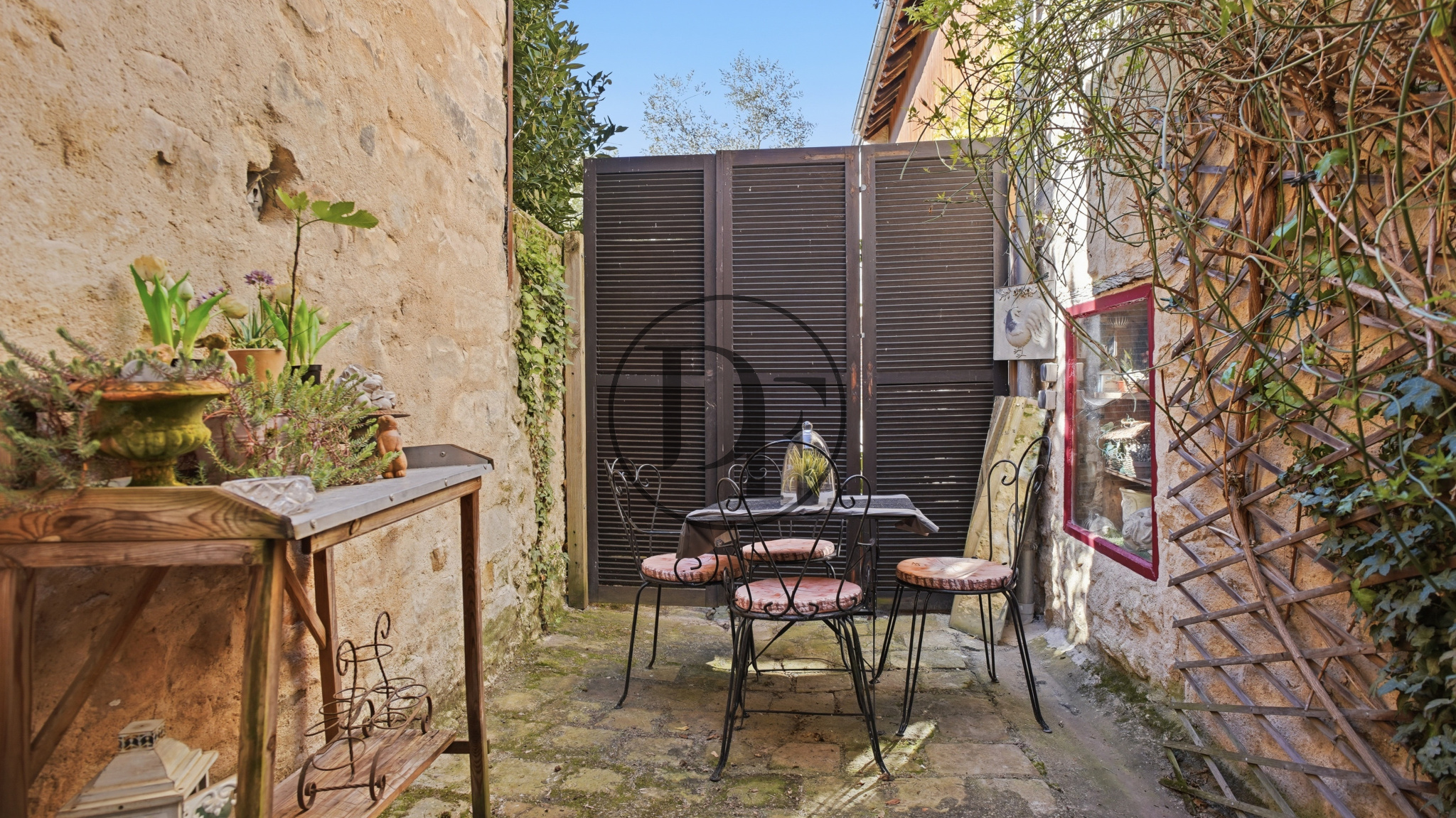 Les extérieurs, véritables havres de paix, offrent un jardin paysager entièrement clos de murs, à l’atmosphère intimiste. Un préau plein de charme permet de profiter des beaux jours en toute saison, tandis qu’un ancien poulailler peut être aménagé en local à vélos.