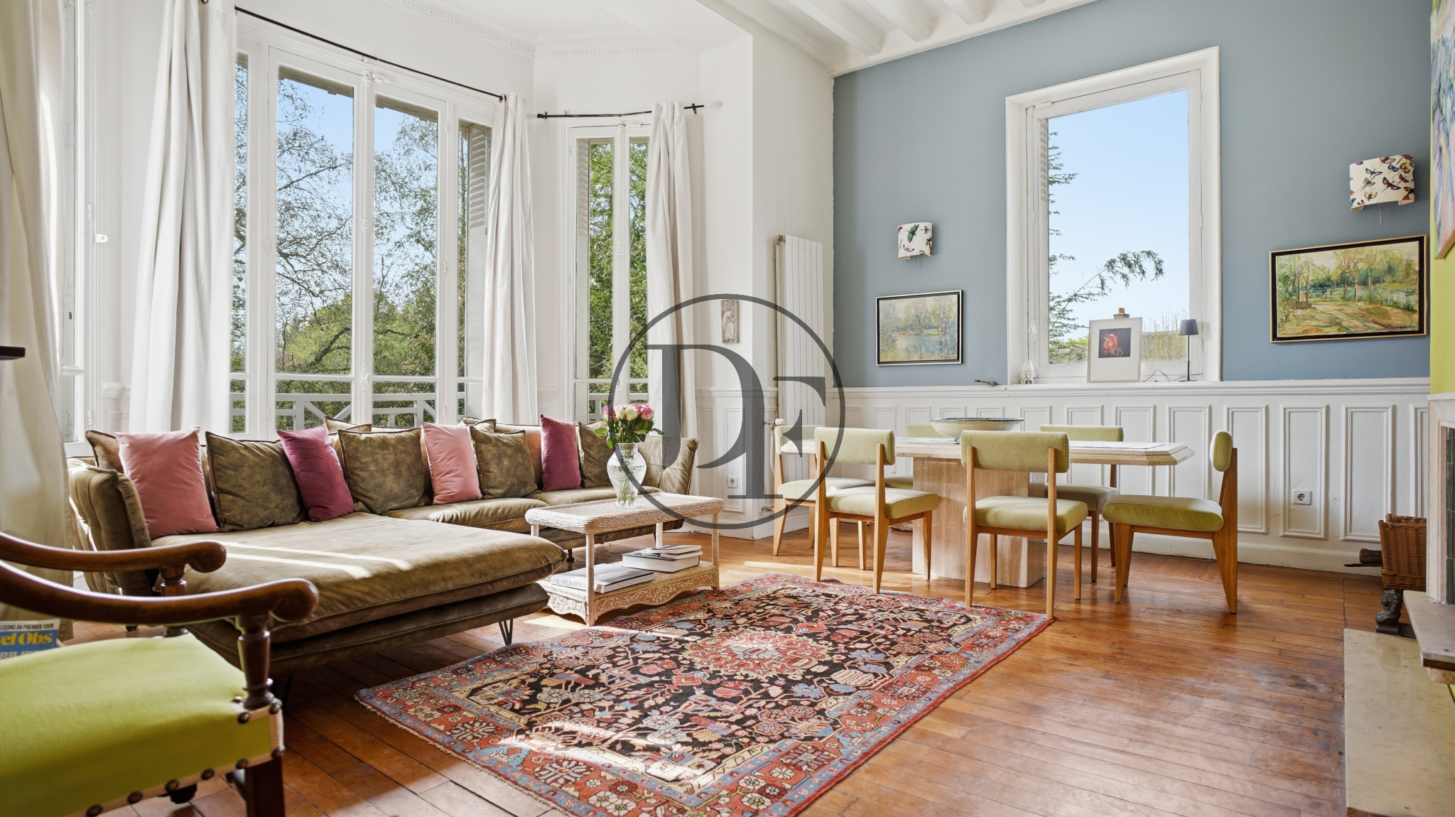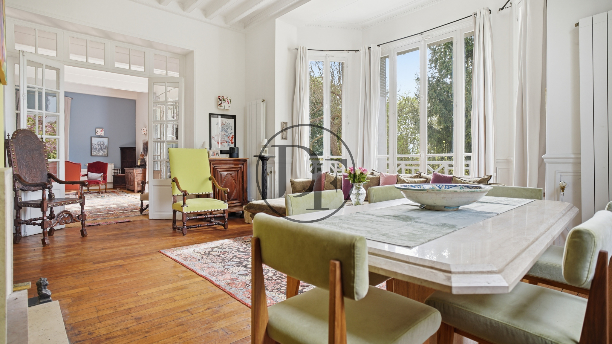 Dès votre arrivée sur le perron, vous découvrez un élégant hall d’entrée traversant décoré d’un sol en granit d’époque desservant un toilette d’invités et un très bel espace de réception. Il se compose d’un vaste salon-séjour de 73m² orné de boiseries murales et baigné de lumière, doté d’un bow window, d’une cheminée et de parquet au sol.