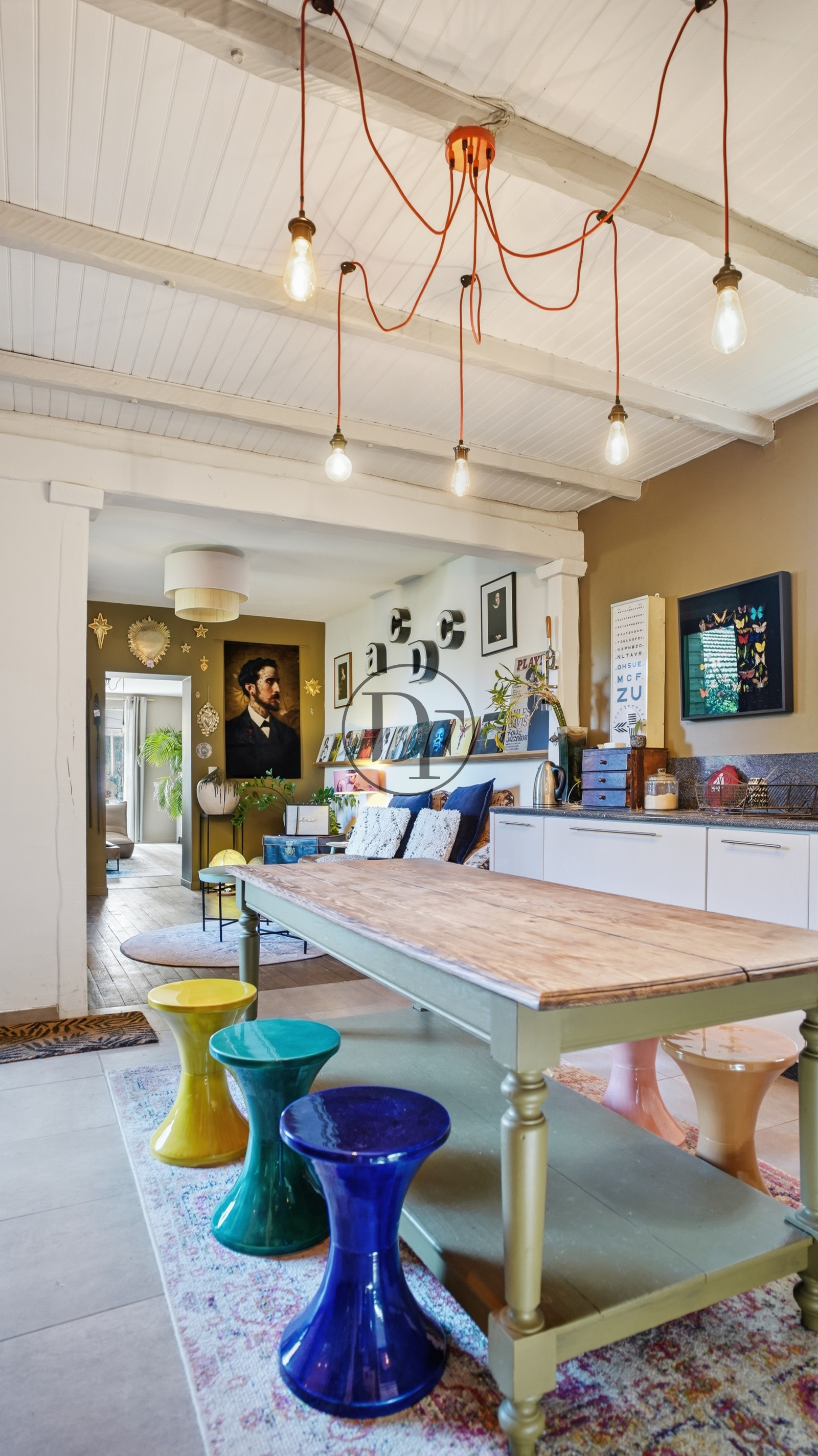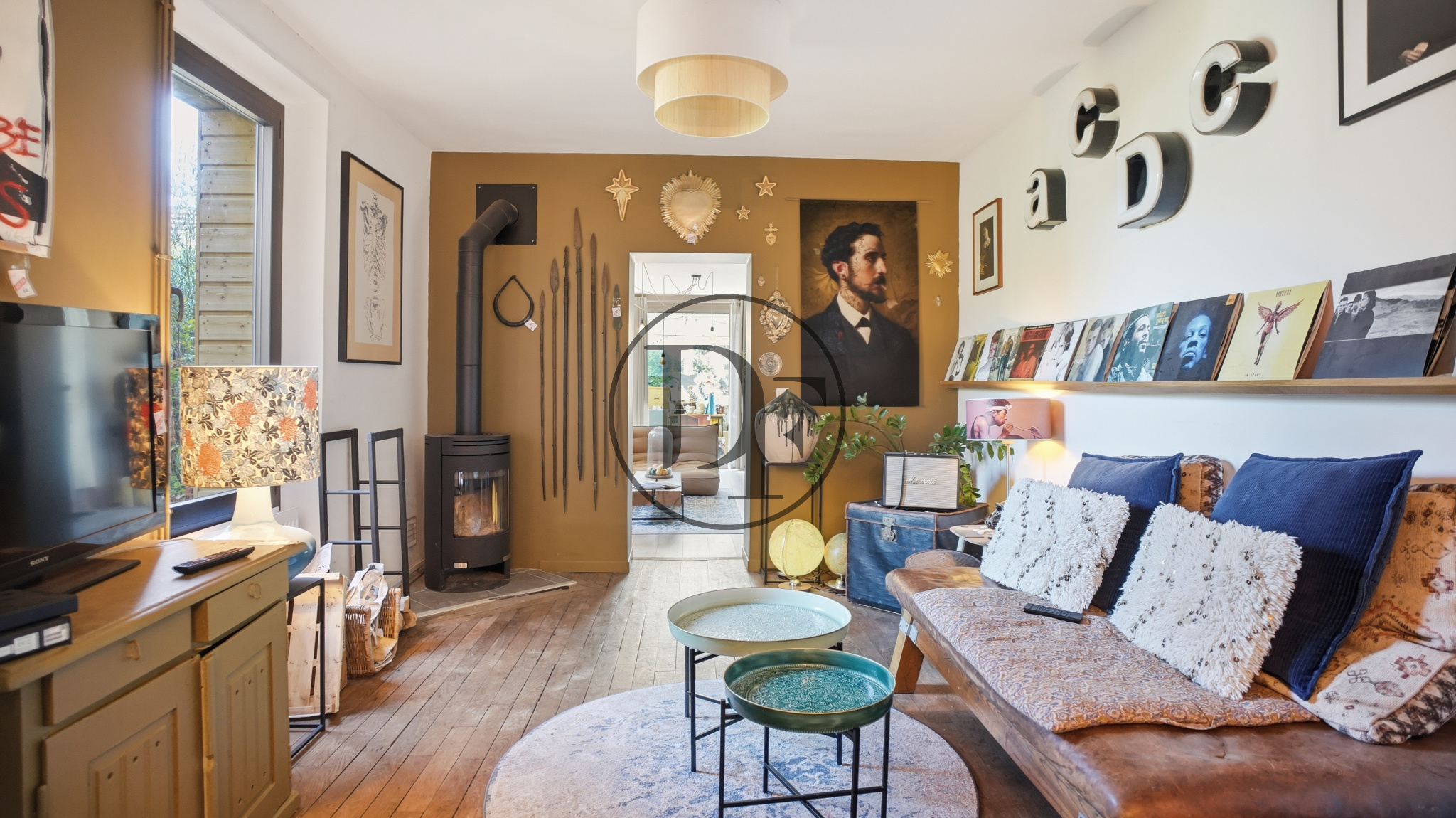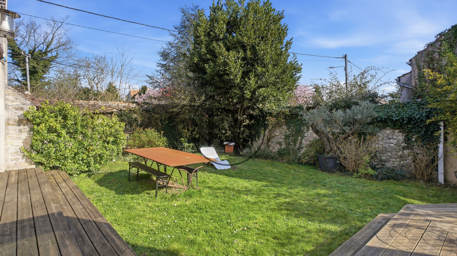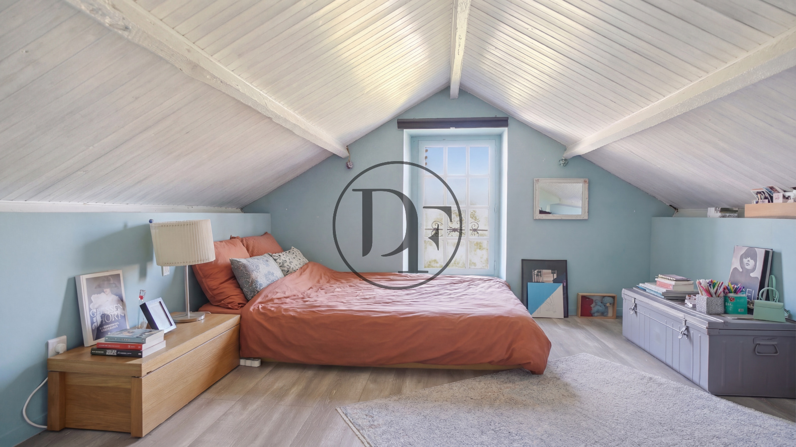 BELLE MAISON ANCIENNE EN PIERRE, LUMINEUSE ET CHATOYANTE OFFRANT 143M2 DE SURFACE HABITABLE ET 185M2 DE SURFACE UTILE, ENTIÈREMENT RÉNOVÉE AVEC GOUT, ÉLÉGANCE ET CONFORT. HABILLÉE D'UN BARDAGE BOIS ET OUVERTE SUR UN DOUBLE JARDIN PAYSAGER ET ARBORÉ DE 394M2, ELLE OFFRE UN CADRE DE VIE INTIME ET APAISANT.