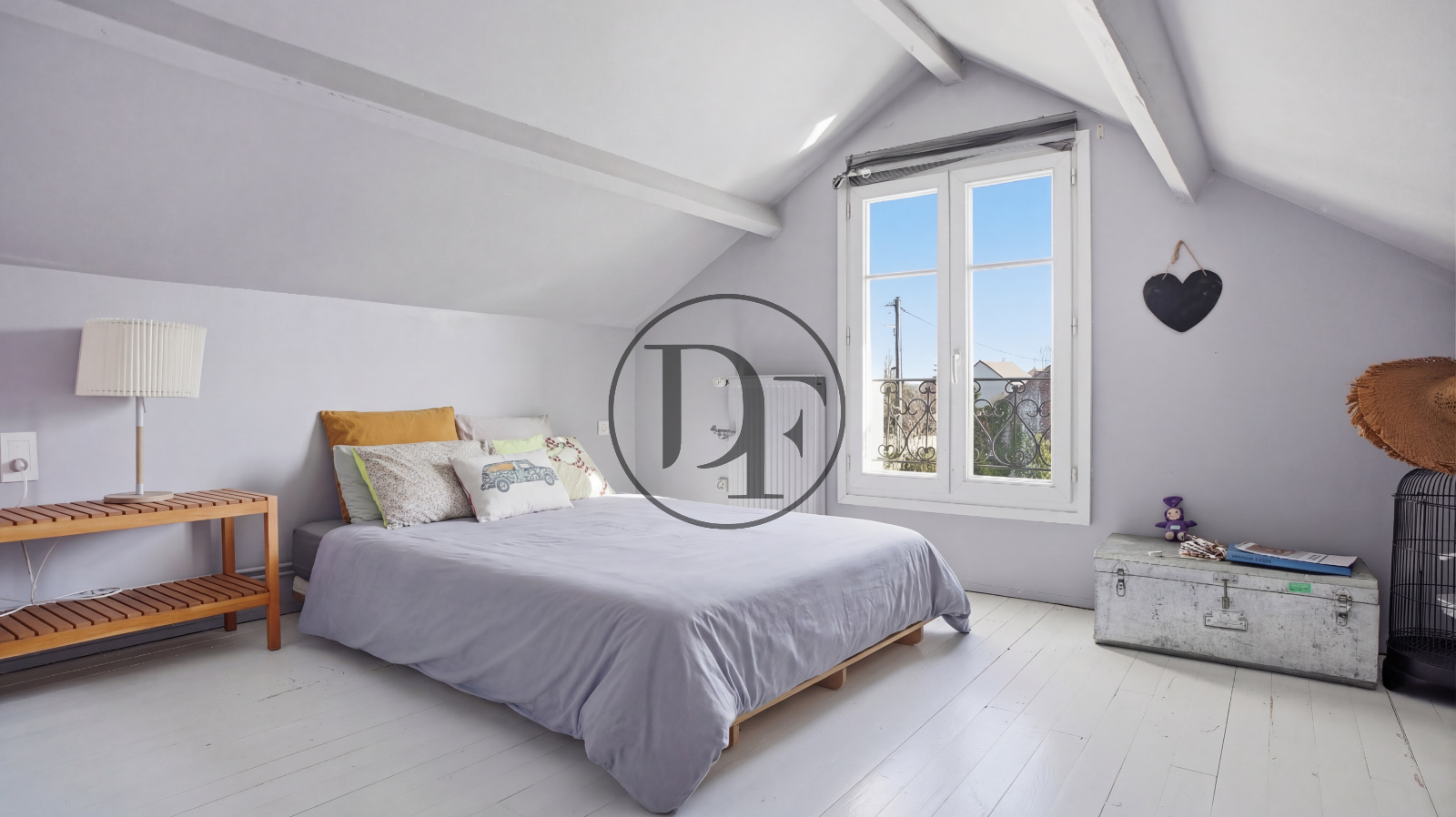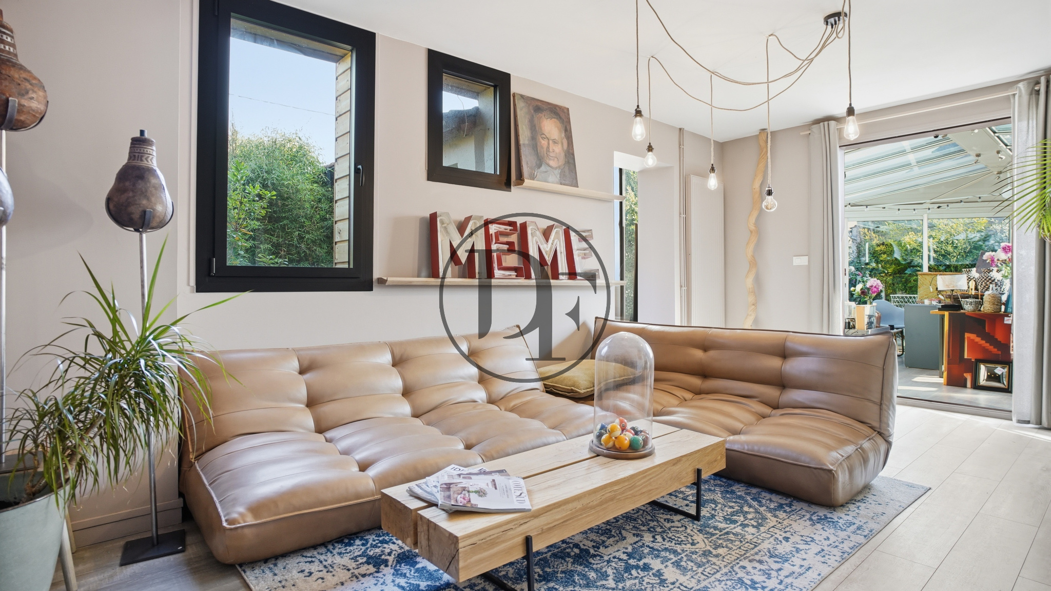 En continuité, une véranda baignée de lumière offre un véritable lien entre intérieur et extérieur. L'espace nuit se compose d'un dégagement desservant une grande suite parentale lumineuse de plain-pied, dotée d’une salle d'eau avec toilette et d’un dressing, l’ensemble donnant accès par de larges baies vitrées sur les deux jardins.
